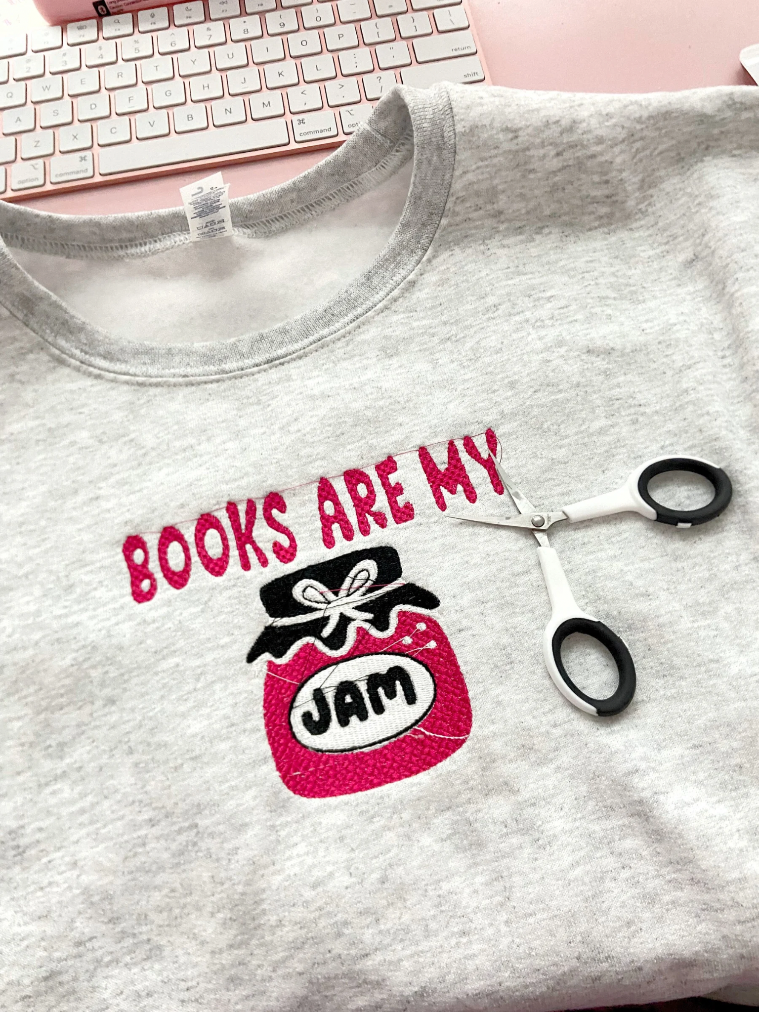 Celebrate your love for reading with this Books Are My Jam embroidered crewneck. Crafted from a soft, durable blend of 50% cotton and 50% polyester, it offers a comfortable, true-to-size fit for all book lovers. The ash grey unisex design makes it a versatile addition to any wardrobe, perfect for cozying up with your favorite novel or showing off your bookish pride wherever you go.